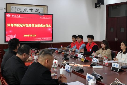 为深入推进学院党建双创工作,以高质量党建引领学院事业高质量发展,彰显体育学院学科专业特色,推动党建工作与教学、训练、科研深度融合,3月12日,体育学院举行冠军先锋党支部成立仪式。学校党委组织部副处级组织员刘肃、体育学院党委书记张其光、体育学院院长黄晓灵,学院教授、冠军先锋党支部书记施廷懋及支部党员参加。仪式由学院党委副书记、纪委书记陈园园主持。