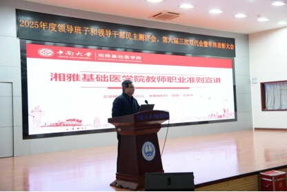 1月27日下午,中南大学湘雅基础医学院2025年度领导班子和领导干部民主测评会、第六届三次双代会暨年终表彰大会在杏林校区图书馆报告厅举行。学校党委组织部副部长张志宏、全体院领导...