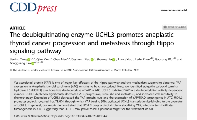 2日22日,中南大学基础医学院肿瘤研究所陶永光研究员与湘雅医院肝脏外科周乐杜教授团队合作在国际著名期刊《Cell Death & Differentiation》(IF=12.07)以论著形式在线发表了题为“The deubiquitinating enzyme UCHL3 promotes anaplastic thyroid cancer progression and metastasis through Hippo signaling pathway(去泛素化酶UCHL3通过Hippo通路促进甲状腺未分化癌进展及转移)”的原创性研究。周乐杜教授、陶永光研究员以及武汉大学吴高松教授为本论文的共同通讯作者,中南大学博士后汤佳宁为论文第一作者。本研究得到了基础医学院肖德胜教授、湘雅医院刘双研究员的大力支持。