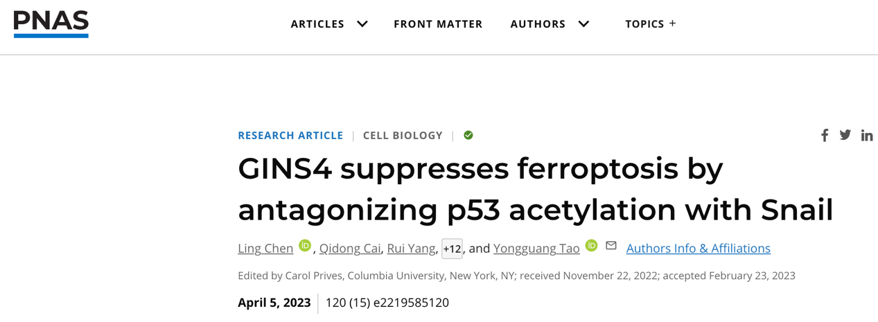 4月5日上述成果在《美国科学院院报》(Proceedings of the National Academy of Sciences of the United States of America,PNAS)在线发表。陶永光研究员以及湘雅医院医学研究中心研究员刘双为本论文的共同通讯作者,中南大学基础医学院肿瘤所实验师陈玲为第一作者。该论文审稿人一致认为,这是一项具有创新性的研究。研究者证实GINS4可作为一种潜在的新型诱导肿瘤细胞铁死亡的靶标,联合针对细胞周期G2/M期的放化疗药物,可增加肿瘤治疗效果。