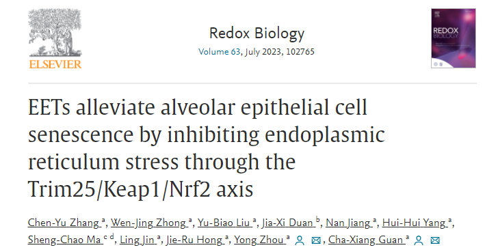 2023年6月2日,中南大学基础医学院管茶香教授团队在国际权威学术期刊《氧化还原生物学》(Redox biology,中科院一区TOP期刊)发表了题为“EETs alleviate alveolar epithelial cell senescence by inhibiting endoplasmic reticulum stress through the Trim25/Keap1/Nrf2 axis(EETs通过Trim25/Keap1/Nrf2轴抑制内质网应激减缓肺泡上皮细胞衰老)”的研究论文。中南大学基础医学院生理学系为第一及通讯作者单位,基础医学院管茶香教授和周勇副教授为本文的共同通讯作者,2020级博士生张晨宇为第一作者。