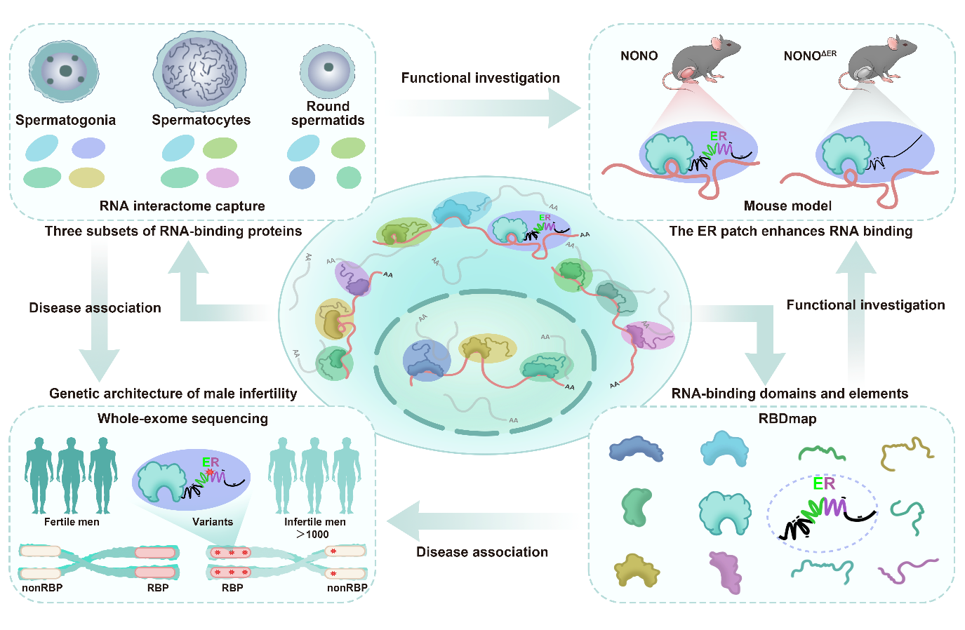 产生结构和功能正常的精子,是所有有性生殖动物繁衍后代的基础。精子在睾丸中发生,并具有进化的保守性。在人类,睾丸内精子发生长达64天,是一个极其复杂而独特的细胞分化和发育过程,受到一组时空特异性表达基因的精密调控。在精子形成过程中,随着精子细胞变形和细胞核的压缩,基因转录活动将逐渐降低直至完全停止,那些为精子细胞后期阶段发育所需的基因都需要提前转录为mRNA,然后通过RNA结合蛋白RBP)以翻译抑制状态储存在精子细胞中,直到特定发育阶段再被激活翻译。RBP在转录或转录后水平调控基因表达,是非编码RNA调控、相分离等过程中的重要组成元件,是精子发生领域的前沿研究热点。人们对于RBP如何动态调节精子发生过程中大量RNA缺乏系统性了解,对于RBP的非结构域元件(不在已注释结构域中的短基序)还未得到充分探索。另外,尽管已报道RBP的功能障碍可能与男性不育(一种全球性的主要生殖问题)有关,但其序列突变与男性不育之间的关联缺乏全基因组水平的认识。