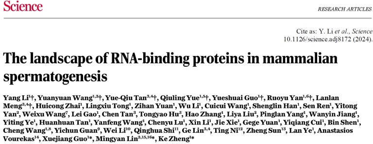 2024年8月30日,中南大学基础医学院生殖与干细胞工程研究所的谭跃球教授课题组,南京医科大学生殖医学与子代健康全国重点实验室郑科教授郭雪江教授及南京医科大学基础医学院神经生物学系林明焰副教授合作,学术期刊《Science》(《科学》)在线发表题为The Landscape of RNA-Binding Proteins in Mammalian Spermatogenesis “哺乳动物精子发生RNA结合蛋白质全景图谱”)的研究论文(Research Article)