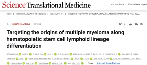 11月19日,中南大学肿瘤研究所周文课题组在国际知名学术期刊《科学转化医学》(Science Translational Medicine) 杂志在线发表最新成果“在造血干细胞淋巴系分化体系中揭示和靶向多发性骨髓瘤起始细胞”(Targeting the origins of multiple myeloma along hematopoietic stem cell lymphoid lineage differentiation)研究论文。该研究由中南大学肿瘤研究所周文教授、军事医学科学院陈河兵教授、中国医学科学院血液与健康全国重点实验室程涛教授课题组合作完成。