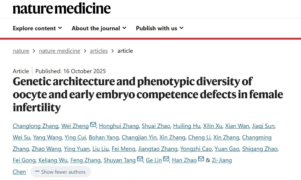 2025年10月16日,中南大学湘雅基础医学院林戈研究员与山东大学陈子江院士、赵涵教授、中南大学生命科学学院郑伟副教授和上海交通大学医学院唐淑妍副研究员团队合作,在Nature Medicine(最新五年影响因子:52.4)期刊发表题为“Genetic architecture and phenotypic diversity of oocyte and early embryo competence defects in female infertility”的研究论文。该研究基于大规模专病队列,率先构建卵子及胚胎发育潜能缺陷(OECD)的六亚型分型体系,并绘制了首张亚型特异性遗传图谱,不仅为相关疾病的个体化检测路径设计提供了分子基础,也为临床精准分型诊断提供了关键的循证依据。