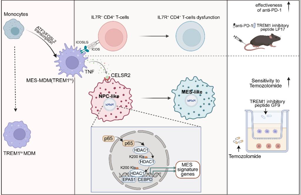胶质母细胞瘤(glioblastoma, GBM)是成人最常见的颅内恶性肿瘤。尽管患者接受了最大范围的手术切除,并辅以替莫唑胺(Temozolomide,TMZ)、放疗、免疫或电场治疗等综合措施,但患者的复发率和耐药性仍然很高。目前,制约GBM预后的生物学因素主要包括肿瘤的高侵袭性、肿瘤细胞和免疫抑制微环境的异质性等。因此,深入解析GBM细胞与免疫微环境的异质性及相互作用规律,对阐明GBM恶性进展的机制及探寻克服TMZ耐药的治疗靶点至关重要。本研究首次鉴定出了高表达TREM1的新型MES-MDM亚群,该亚群可通过非经典的TNF-CELSR2配受体对介导肿瘤细胞HDAC1的K200位点发生乳酸化修饰,促进肿瘤细胞向MES-GBM细胞恶性转化。TREM1抑制肽靶向MES-MDM可增加GBM对TMZ的敏感性。本研究揭示了MDM新亚群导致GBM恶性进展的新机制,并为增加TMZ治疗敏感性提供了新靶点。