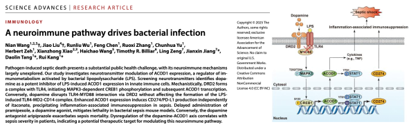 病原体诱导的脓毒症死亡构成了重大的公共卫生挑战,其神经免疫机制尚未被充分阐明。本研究旨在探讨神经递质对ACOD1表达的调控作用。ACOD1是由细菌脂多糖(LPS)激活的免疫代谢调节因子。通过筛选多种神经递质,研究者发现多巴胺在先天免疫细胞中可显著抑制LPS诱导的ACOD1表达。机制上,DRD2可与TLR4形成复合物,进而激活MAPK3依赖的CREB1磷酸化,启动ACOD1转录。相反,多巴胺通过DRD2干扰TLR4与MYD88的相互作用,但并不影响LPS诱导的TLR4-MD2-CD14复合物的形成。ACOD1表达上调可诱导CD274/PD-L1的生成,而这一过程独立于其代谢产物itaconate,从而在脓毒症中加剧炎症相关的免疫抑制。研究者进一步发现,延迟给予多巴胺受体激动剂普拉克索(pramipexole)可显著降低细菌性脓毒症小鼠模型的死亡率;相反,使用多巴胺受体拮抗剂阿立哌唑(aripiprazole)则加剧了脓毒症的致死率。此外,患者体内多巴胺-ACOD1轴的调控失衡与脓毒症严重程度密切相关,提示该神经免疫通路可能为未来脓毒症治疗提供新的靶点。上述发现揭示了神经递质与先天免疫之间的直接联系,并提示通过调控ACOD1信号通路可为致死性感染提供潜在治疗策略。