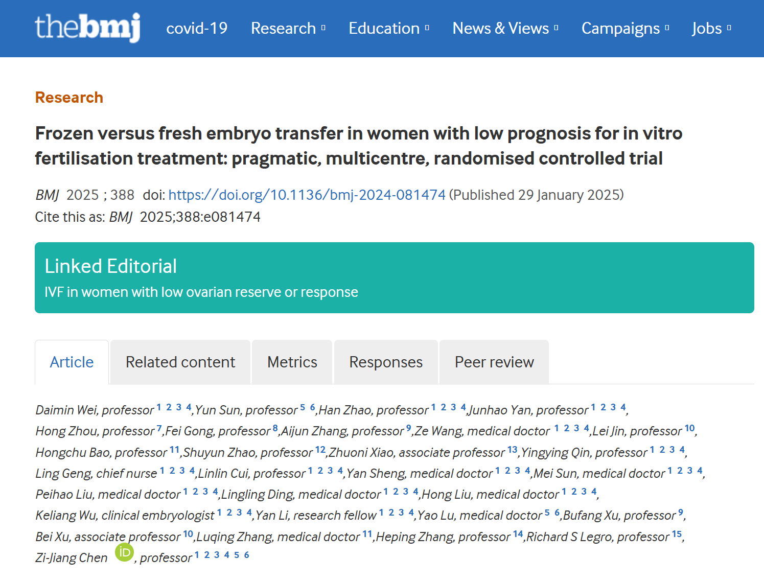 近期,国际顶级医学学术期刊The BMJ《英国医学杂志》发布中南大学湘雅基础医学院生殖与干细胞工程研究所龚斐团队参与的一项多中心、前瞻性随机对照临床研究成果“Frozen versus fresh embryo transfer in women with low prognosis for in vitro fertilisation treatment: pragmatic, multicentre, randomised controlled trial(鲜胚移植可提高预后不佳IVF患者活产率及累积活产率)”。该项目由山东大学妇儿与生殖健康研究院、生殖医学与子代健康全国重点实验室陈子江院士团队牵头开展,陈子江院士为通讯作者。山东大学妇儿与生殖健康研究院魏代敏教授、赵涵教授、颜军昊教授,上海交通大学医学院附属仁济医院孙赟教授,广西自治区妇幼保健院周红教授,中南大学湘雅基础医学院龚斐副教授为论文共同第一作者。