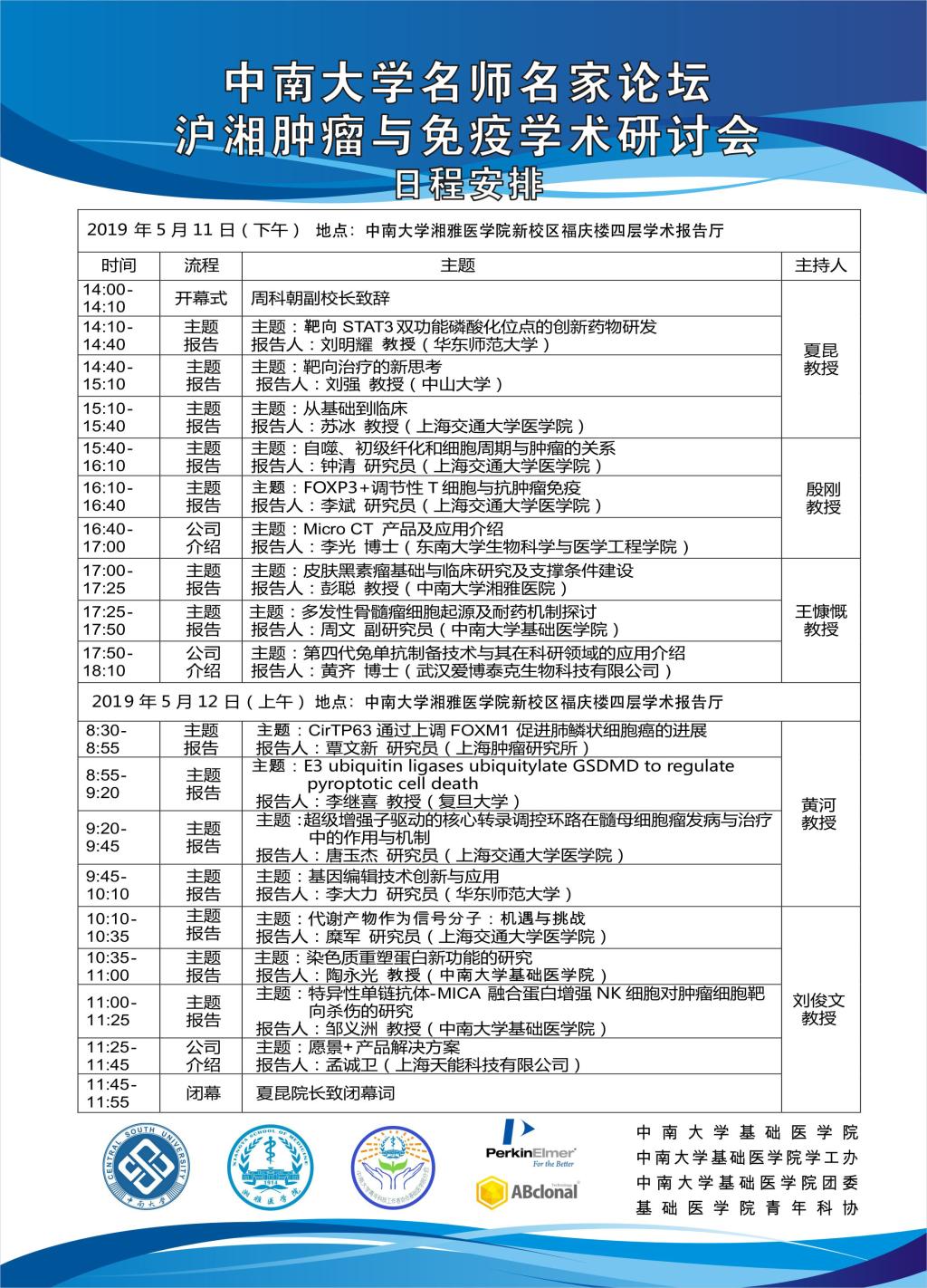 【中南大学名师名家论坛】沪湘肿瘤与免疫学术研讨会日程安排