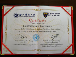 我校代表队从2016年开始每年组队参加该项赛事,继去年获得一等奖后,今年在许建平和韩仰两位老师的带领下,由临床医学五年制张德阗、丁茜、徐璐、郭一鸣、刘悦、李子铭,临床医学八年制刘宏宇,口腔医学专业叶晨和薛江,药学专业的刘淑芩10位同学组成中南大学代表队再次参赛并获得一等奖, 同学们从去年9月份开始便着手准备竞赛,通过坚持不懈的努力终于取得优异成绩。本次大赛也是生理学系组织本科医学生迎战在马来西亚举行的第16届国际生理学知识竞赛的热身赛。