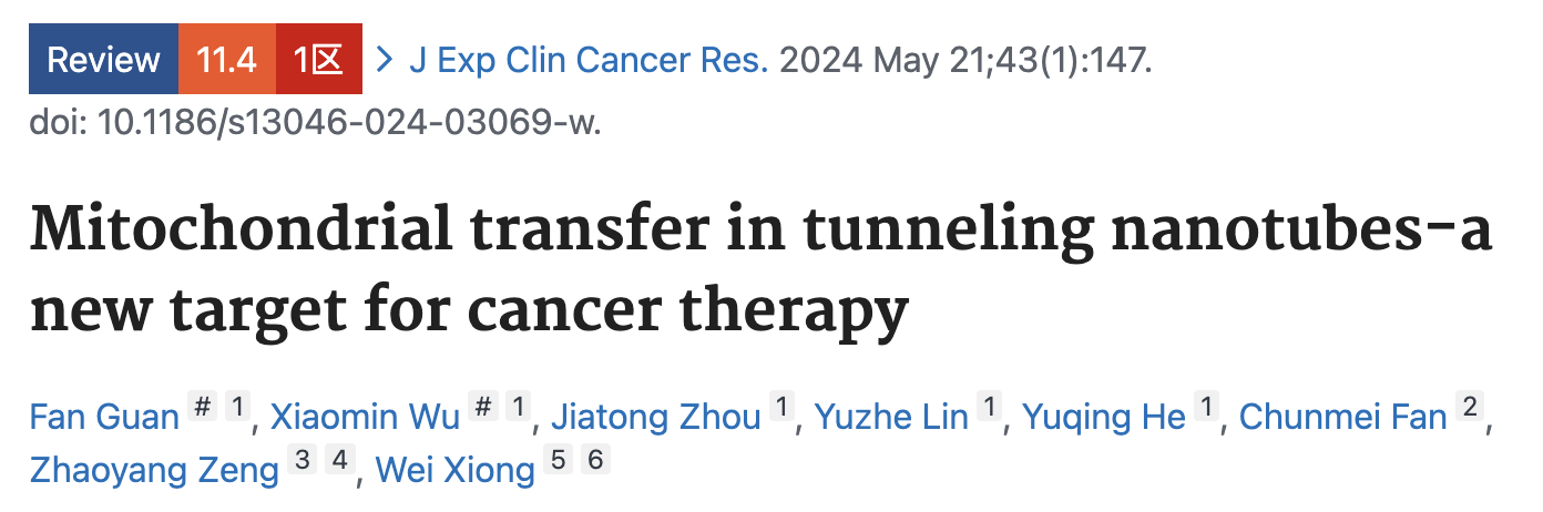 近日,由中南大学基础医学院首届基础医学拔尖班(2021级)关凡同学与吴晓敏等合作在《J Exp Clin Cancer Res》杂志发表了一篇题为“Mitochondrial transfer in tunneling nanotubes-a new target for cancer therapy”的综述。中南大学基础医学院熊炜研究员、曾朝阳研究员和范春梅副教授为本文的指导老师。