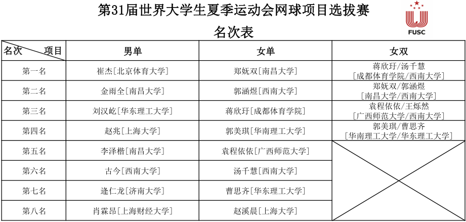经过3天98场比赛的激烈角逐,4月19日下午,第31届世界大学生夏季运动会网球项目选拔赛在衡阳博雅国际网球中心落幕。根据赛事规则,获得男子单打前六名、女子双打冠军、女子单打前四名的运动员将入选中国大学生网球队大名单。西南大学网球代表队郭涵煜、汤千慧和古今等3人入选,入选人数与南昌大学并列第一。
