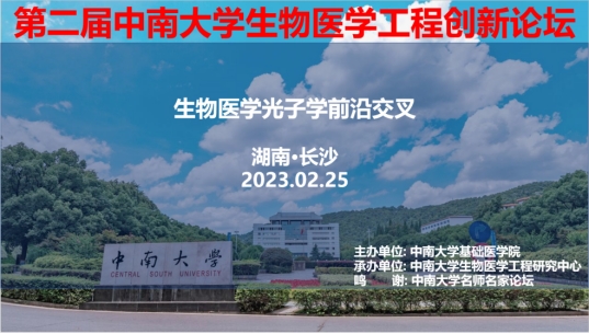 2023年2月25日上午,由中南大学基础医学院主办,中南大学生物医学工程研究中心承办的“第二届中南大学生物医学工程创新论坛暨中南大学名师名家论坛”在湘雅新校区福庆楼4楼报告厅圆满举办。受邀出席的报告嘉宾为南方科技大学蒋兴宇教授、北京大学陈良怡教授、厦门大学刘刚教授、中科院武汉病毒研究所崔宗强研究员以及南方科技大学吴长锋教授;出席本次论坛的领导有中南大学基础医学院党委书记李顺长,基础医学院、湘雅三医院院长江泓,基础医学院副院长殷刚、黄河,生物医学工程研究中心主任董竹新,生物医学工程党支部书记陈昊彬。校内百余名师生到现场就“生物医学光子学前沿交叉”这个主题与五位专家交流互动。