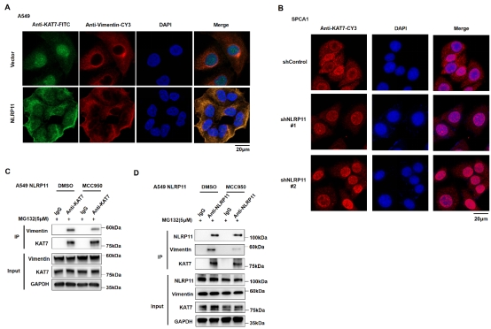 图1. NLRP11对KAT7胞浆易位的调控及MCC950对NLRP11/KAT7/Vimentin间相互作用的影响