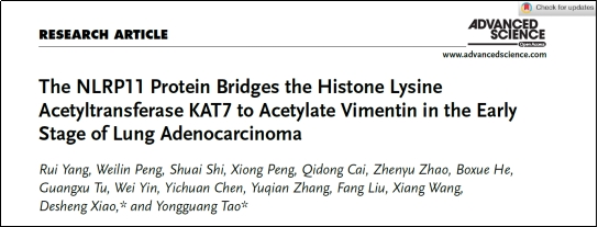 近日,中南大学基础医学院陶永光/肖德胜教授团队在国际期刊Advanced Science(IF=15.1)发表题为The NLRP11 protein bridges the histone lysine acetyltransferase KAT7 to acetylate vimentin in the early stage of lung adenocarcinoma的原创性研究论文,陶永光教授、肖德胜教授为该文的共同通讯作者,中南大学博士研究生杨瑞为第一作者。