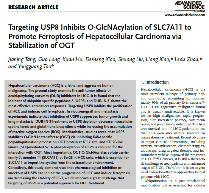 近日,中南大学基础医学院陶永光教授团队与湘雅医院周乐杜、肖亮教授肝脏外科团队在国际著名期刊《Advanced Science》以论著形式在线发表了题为“Targeting USP8 Inhibits O-GlcNAcylation of SLC7A11 to Promote Ferroptosis of Hepatocellular Carcinoma via Stabilization of OGT”(靶向USP8通过OGT抑制SLC7A11糖基化促进肝癌铁死亡)的原创性研究。陶永光教授、周乐杜教授、肖亮教授为本论文的共同通讯作者,中南大学湘雅医院肝脏外科博士后汤佳宁为论文第一作者。湘雅医院肿瘤科刘双教授、基础医学院/湘雅医院病理科肖德胜教授为该研究提供大力支持。