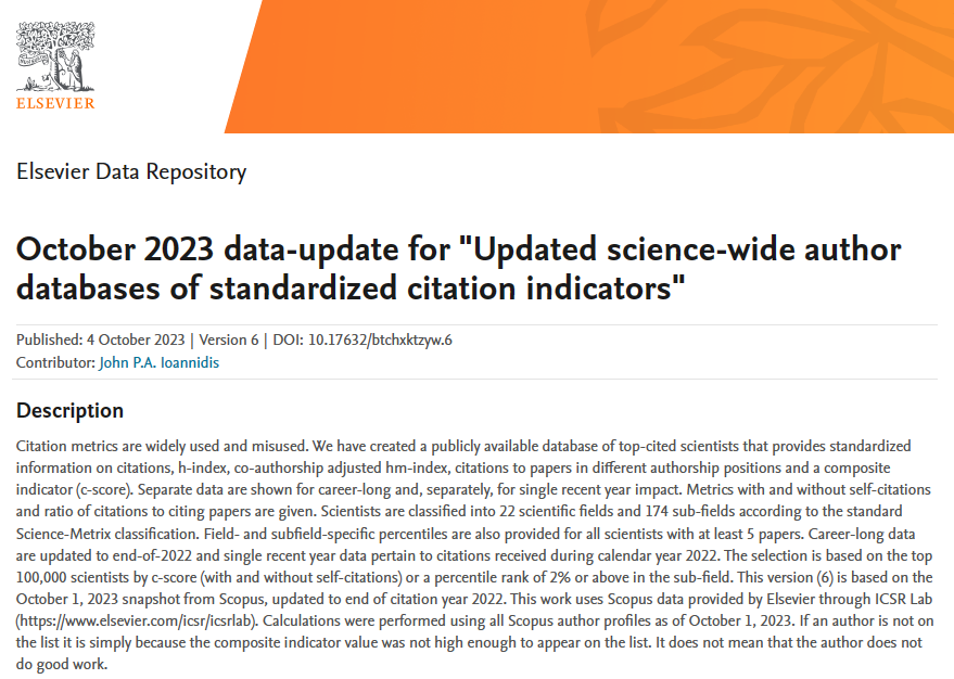近日,美国斯坦福大学和爱思唯尔数据库(Elsevier Data Repository)正式发布了2023全球前2%顶尖科学家榜单(https://elsevier.digitalcommonsdata.com/datasets/btchxktzyw/6/?ref=foititikanea.gr),该榜单分为《年度科学影响力排行榜(2022)》和《终身科学影响力排行榜(1960-2022)》两份榜单,我院共有彭淑平、曹亚、曾朝阳、熊炜、周鸣和陶永光等6位教授入选全球前2%年度科学影响力排行榜,彭淑平教授同时入选全球前2%终身科学影响力排行榜。