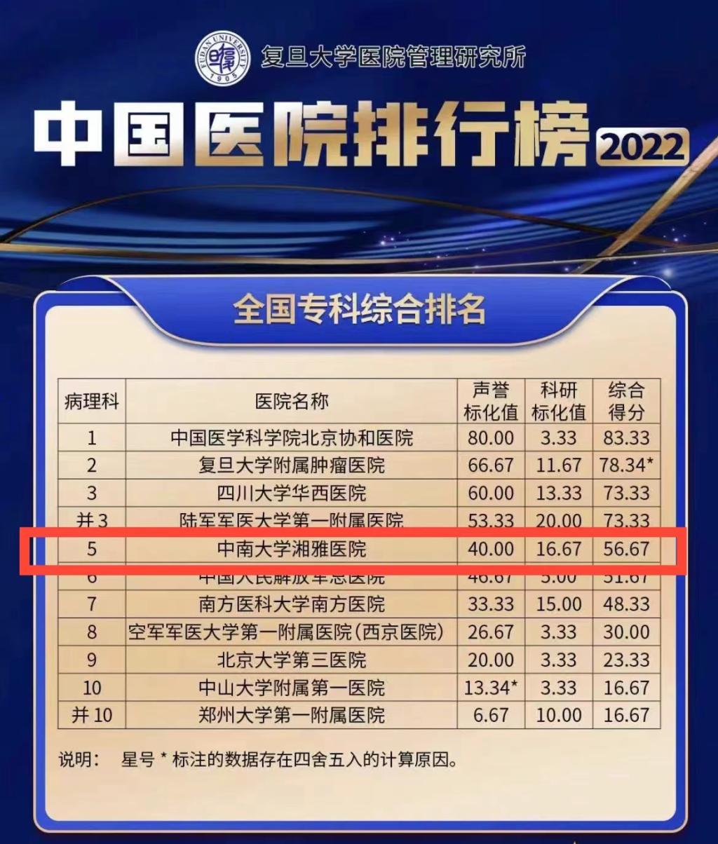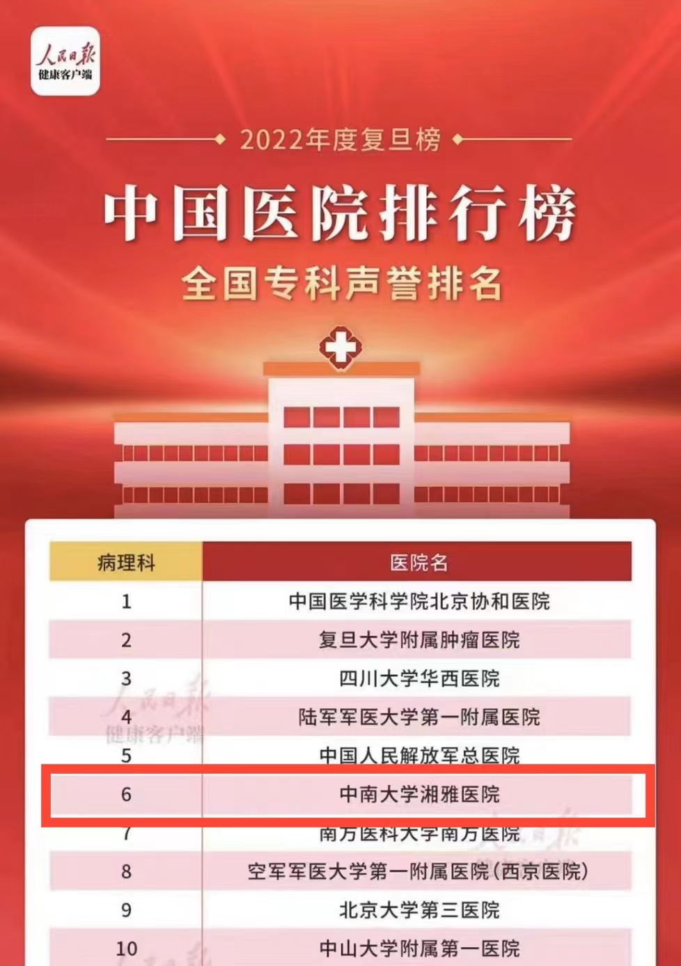11月25日,复旦大学管理研究所公布了“2022年度中国医院排行榜”,中南大学基础医学院病理学系/湘雅医院病理科荣登第五位!专科声誉排名全国第六位!