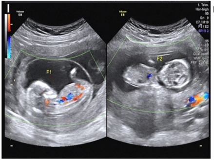 图:46,XX/46,XY嵌合体女性通过辅助生殖技术成功妊娠双胎的影像学图,双胎卵子均为X,其中一个卵子的颗粒细胞100%均为XY核型,一个卵子的颗粒细胞为46,XX/46,XY嵌合体核型