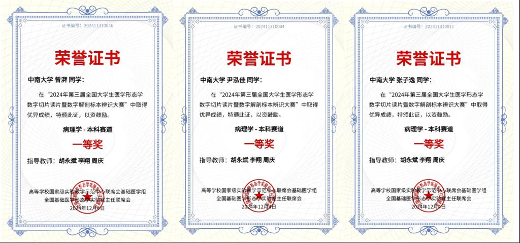 2024年12月1日,备受瞩目的“第三届高等医学院校大学生数字形态学读片和数字解剖标本辨识技能大赛”完美收官!经过激烈角逐,最终我院病理学系胡永斌、李翔、周庆三位老师指导选手在病理学专业组荣获11个奖项,其中一等奖3项、二等奖4项、三等奖4项,并荣获卓越团体奖,为湘雅110周年华诞献上一份厚礼。