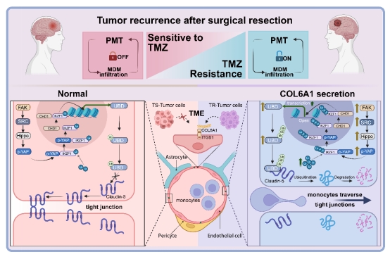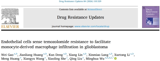 2025年11月22日,湘雅基础医学院/芙蓉实验室高伟博士/武明花教授在Drug Resistance Updates杂志在线发表最新成果Endothelial cells sense temozolomide resistance to facilitate monocyte-derived macrophage infiltration in glioblastoma研究论文,揭示了替莫唑胺耐药通过破坏内皮屏障功能促进胶质母细胞瘤单核细胞来源的巨噬细胞浸润的机制,该研究将化疗耐药性与血管和免疫重塑联系起来,为复发胶质母细胞瘤提供了靶向治疗新策略。