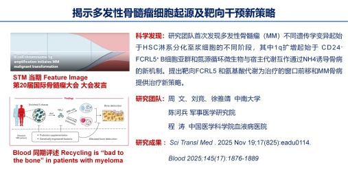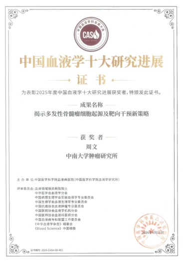 2026年1月11日,第六届中国血液学科发展大会揭晓了“2025年度中国血液学十大研究进展”,中南大学湘雅基础医学院肿瘤研究所周文教授团队成果“揭示多发性骨髓瘤细胞起源及靶向干预新策略”入选。