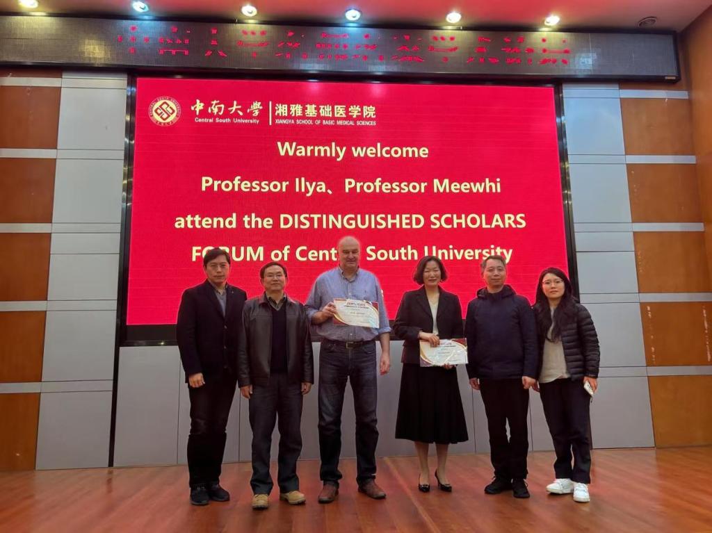 Ilya Bezprozvanny和Meewhi Kim教授访问湘雅期间,与中南大学国际交流与合作处处长殷刚教授、湘雅基础医学院党委书记王慷慨教授、湘雅三医院院长江泓教授等进行了深入交流,并探讨了进一步深入开展合作研究的模式。